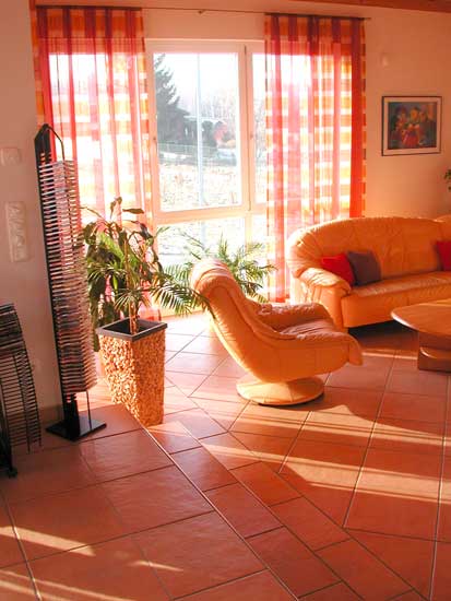 Großformatige Steinzeug-Fliesen mit Belagswechsel.